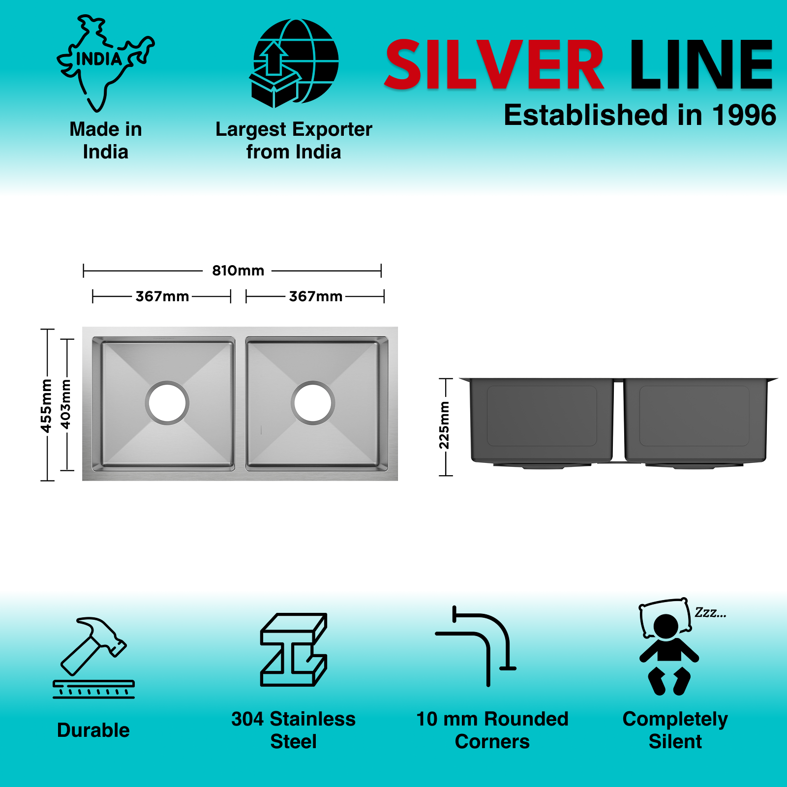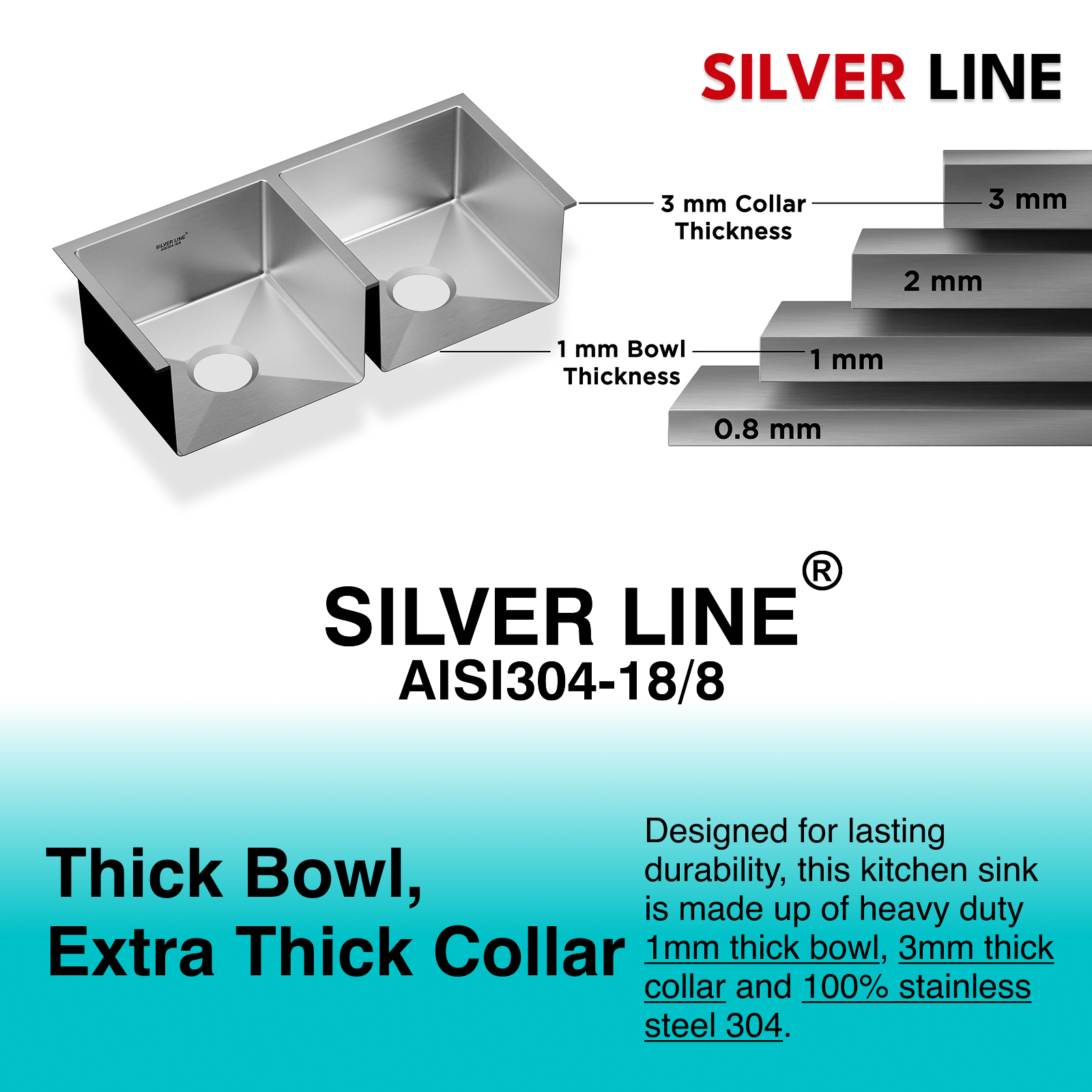 - Sheet Thickness: Handcrafted with 1mm thick bowl and 3mm thick collar, Silver Line sinks boast thickness profile that is made for longevity and silent performance.