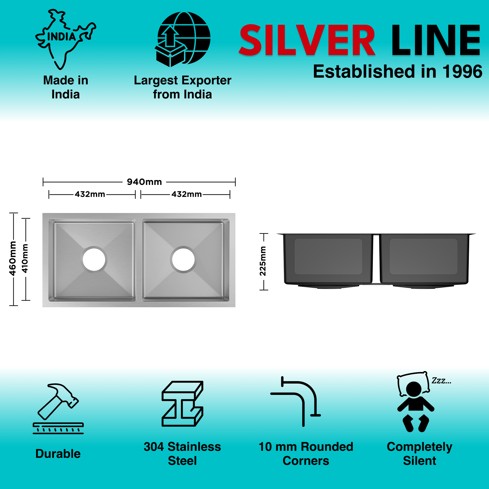 Handmade Double Bowl 304 Grade Kitchen Sink (37" x 18" x 9") - Silver Line