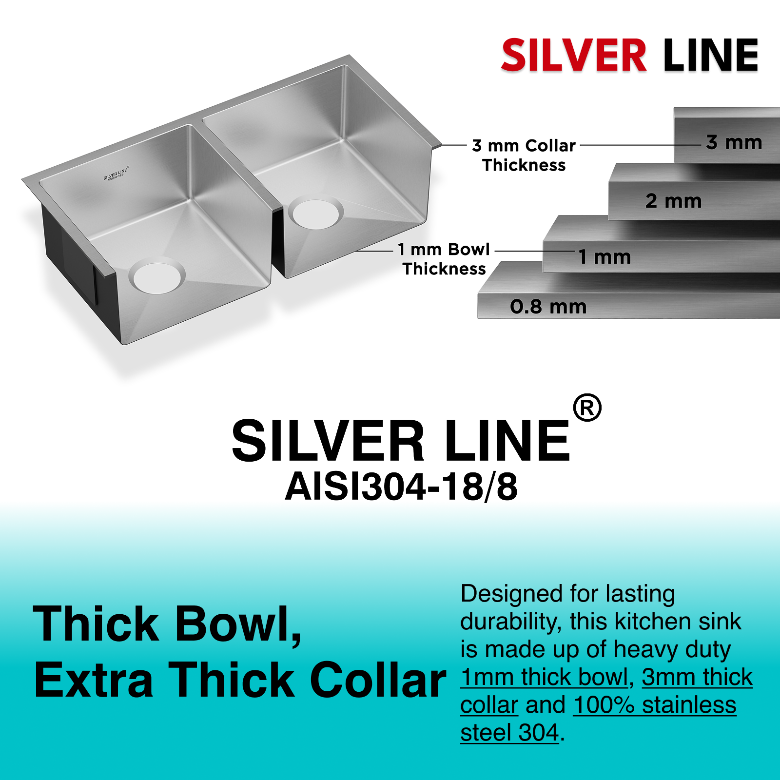 - Sheet Thickness: Handcrafted with 1mm thick bowl and 3mm thick collar, Silver Line sinks boast thickness profile that is made for longevity and silent performance.