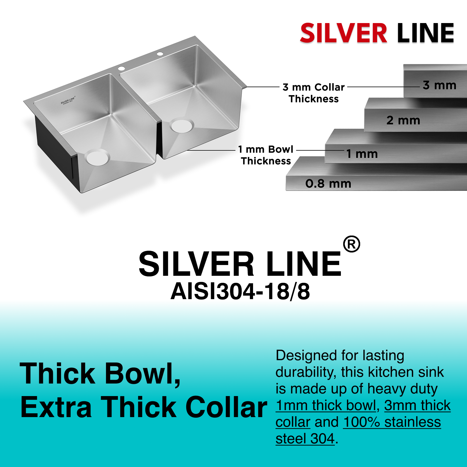 - Sheet Thickness: Handcrafted with 1mm thick bowl and 3mm thick collar, Silver Line sinks boast thickness profile that is made for longevity and silent performance.