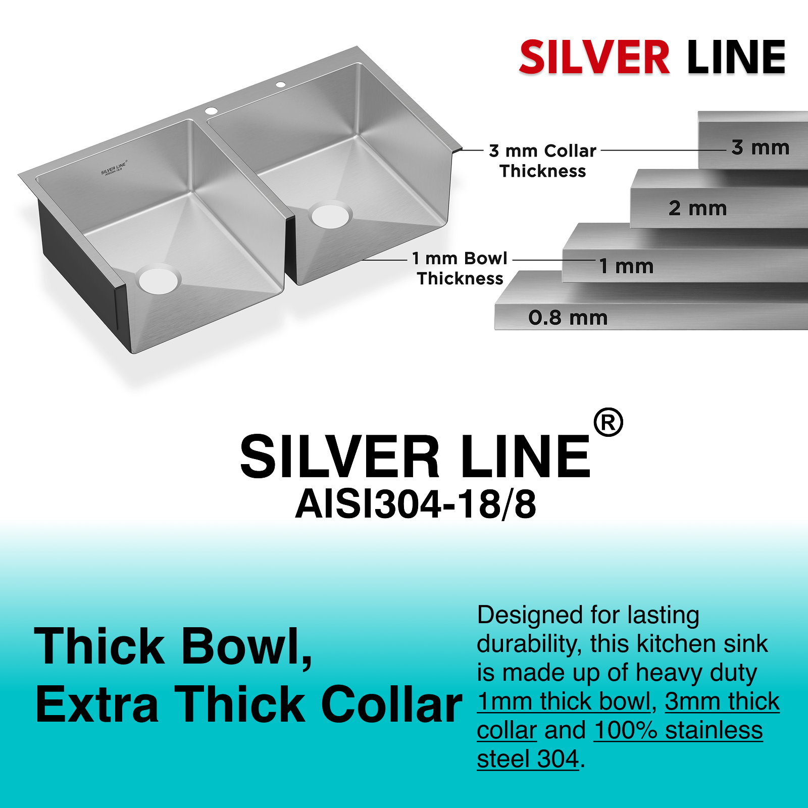 - Sheet Thickness: Handcrafted with 1mm thick bowl and 3mm thick collar, Silver Line sinks boast thickness profile that is made for longevity and silent performance.