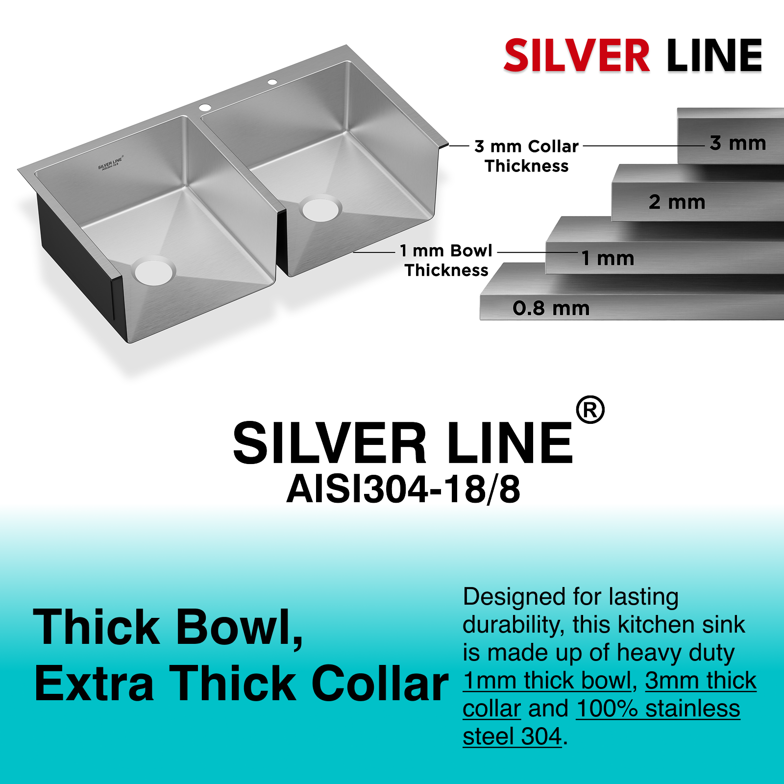 - Sheet Thickness: Handcrafted with 1mm thick bowl and 3mm thick collar, Silver Line sinks boast thickness profile that is made for longevity and silent performance.