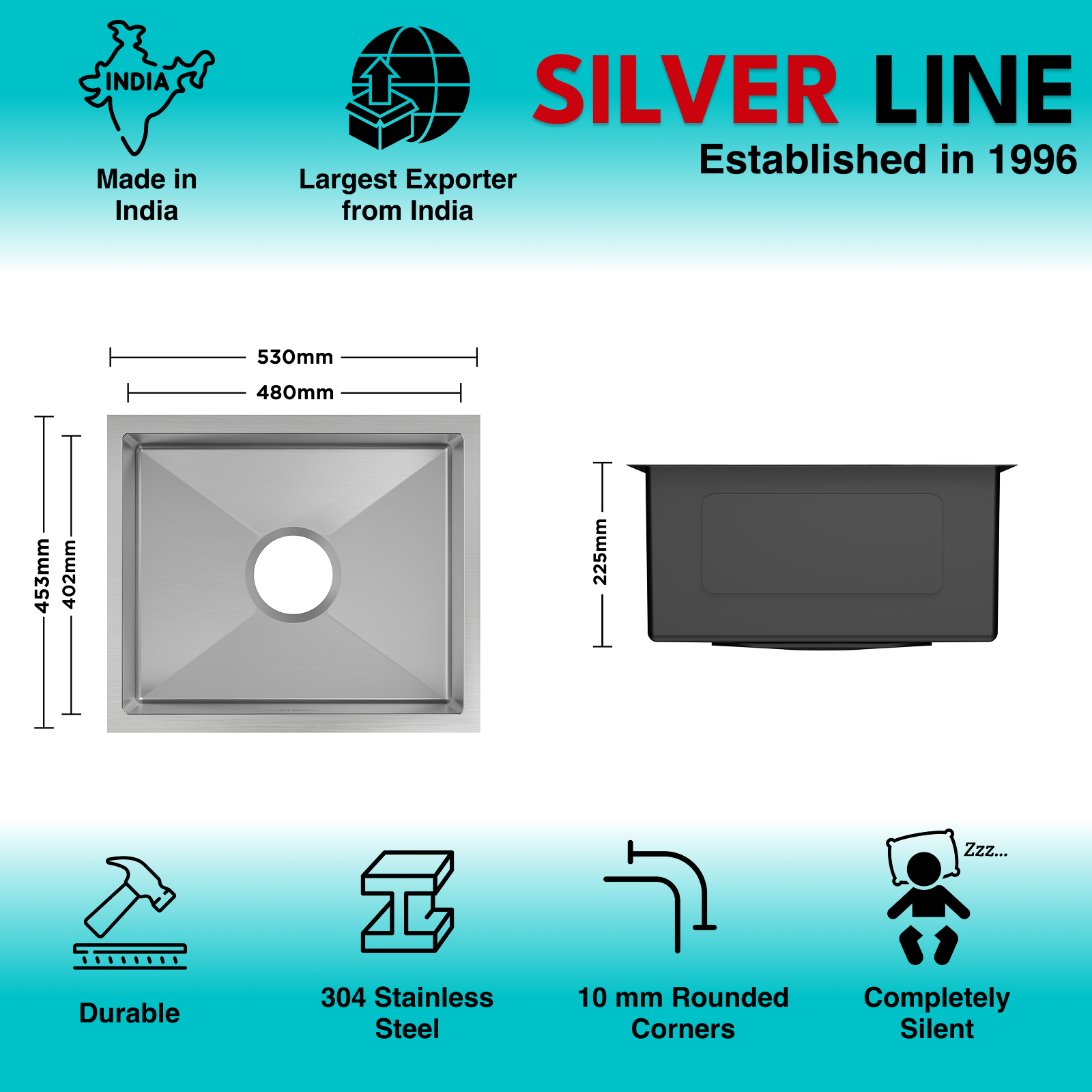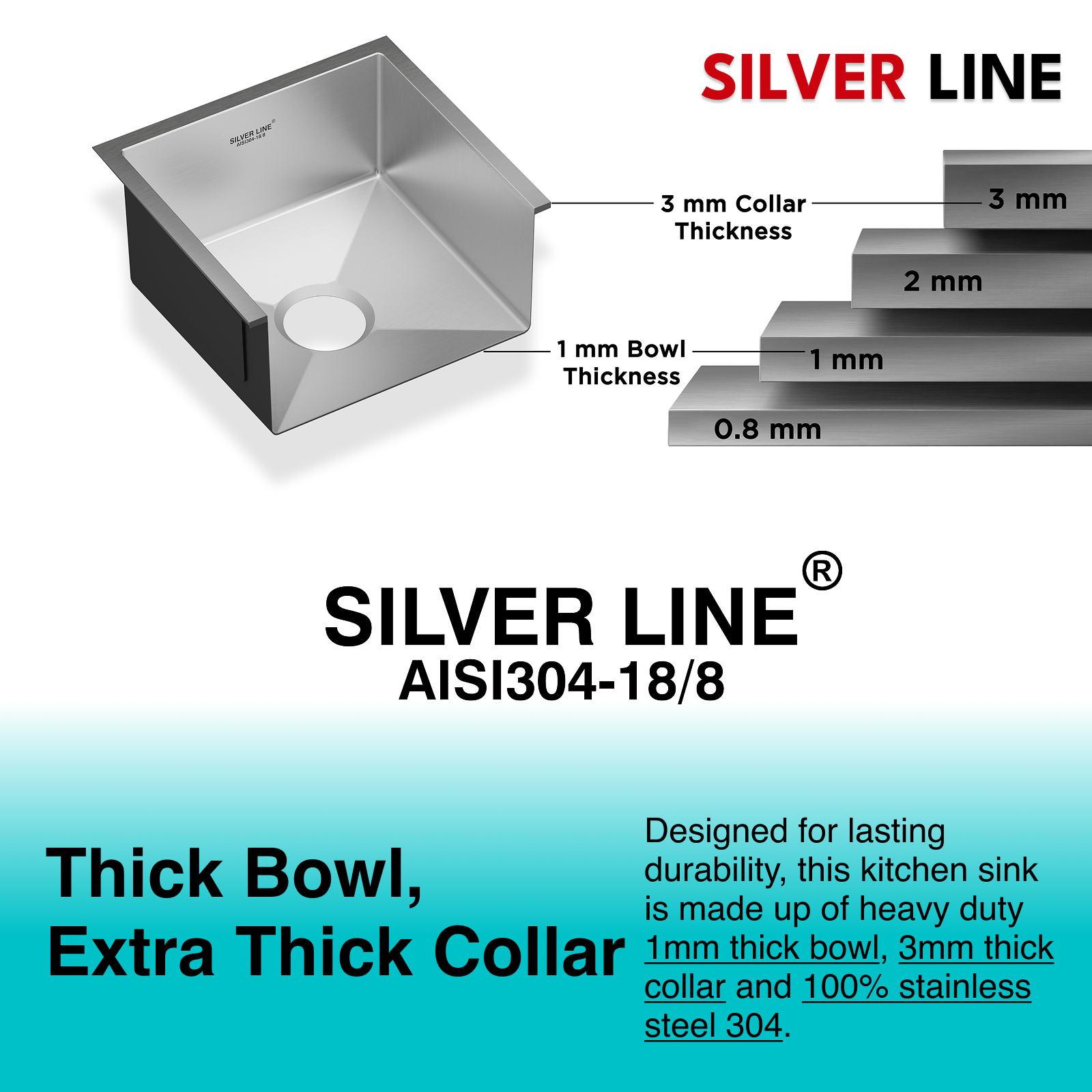 - Sheet Thickness: Handcrafted with 1mm thick bowl and 3mm thick collar, Silver Line sinks boast thickness profile that is made for longevity and silent performance.