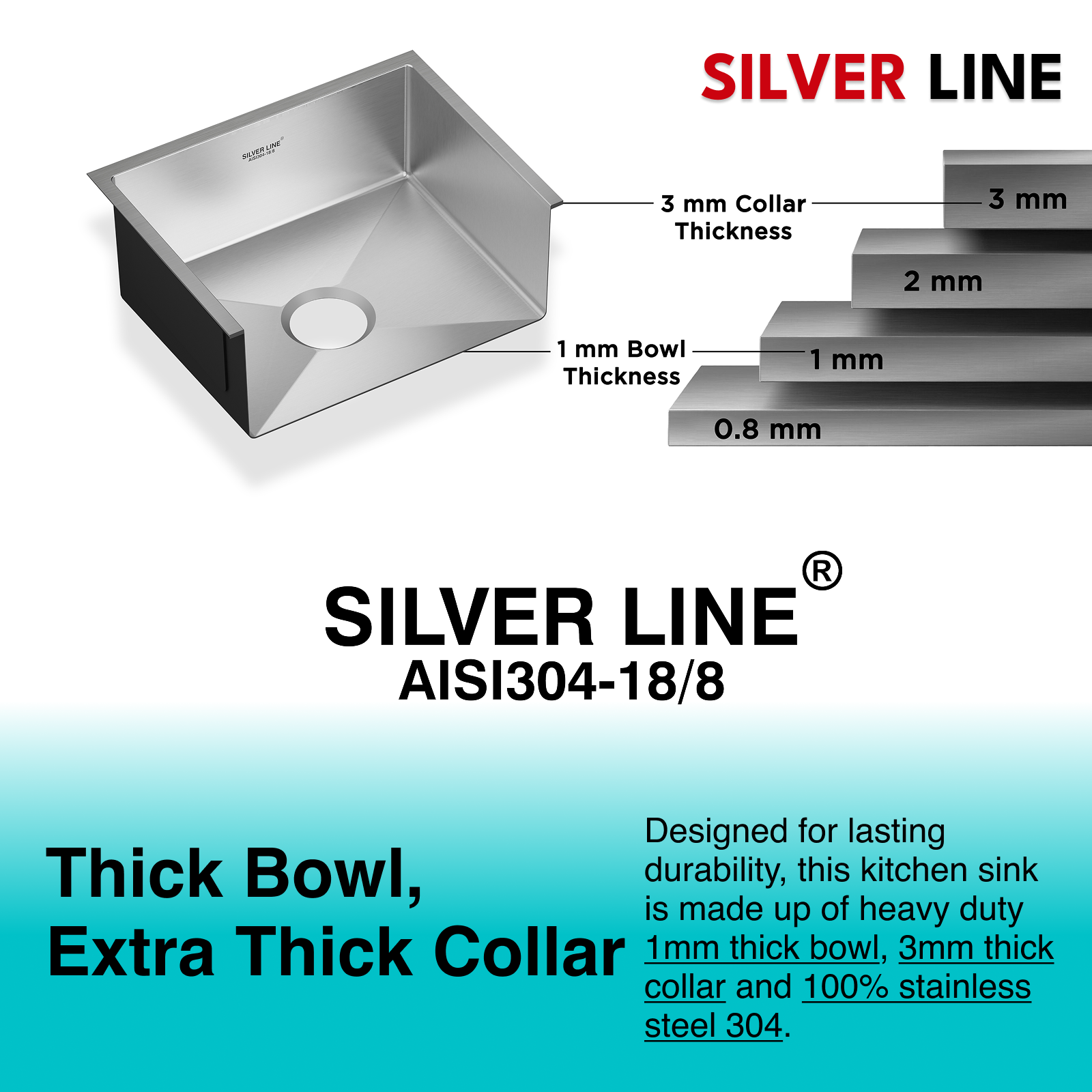 - Sheet Thickness: Handcrafted with 1mm thick bowl and 3mm thick collar, Silver Line sinks boast thickness profile that is made for longevity and silent performance.