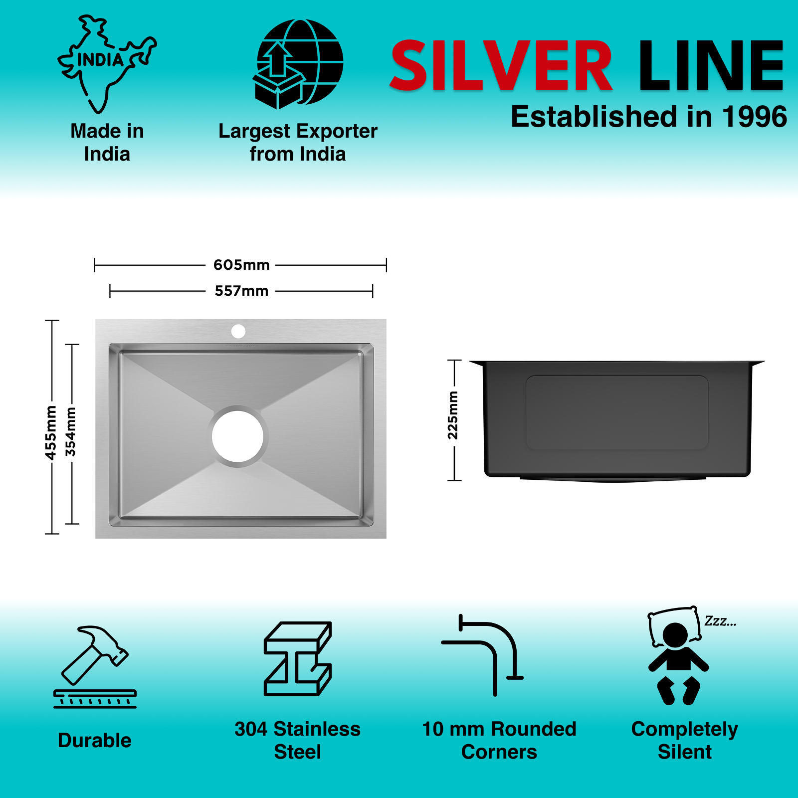 Handmade Single Bowl 304 Grade Kitchen Sink (24" x 18" x 9") - Silver Line