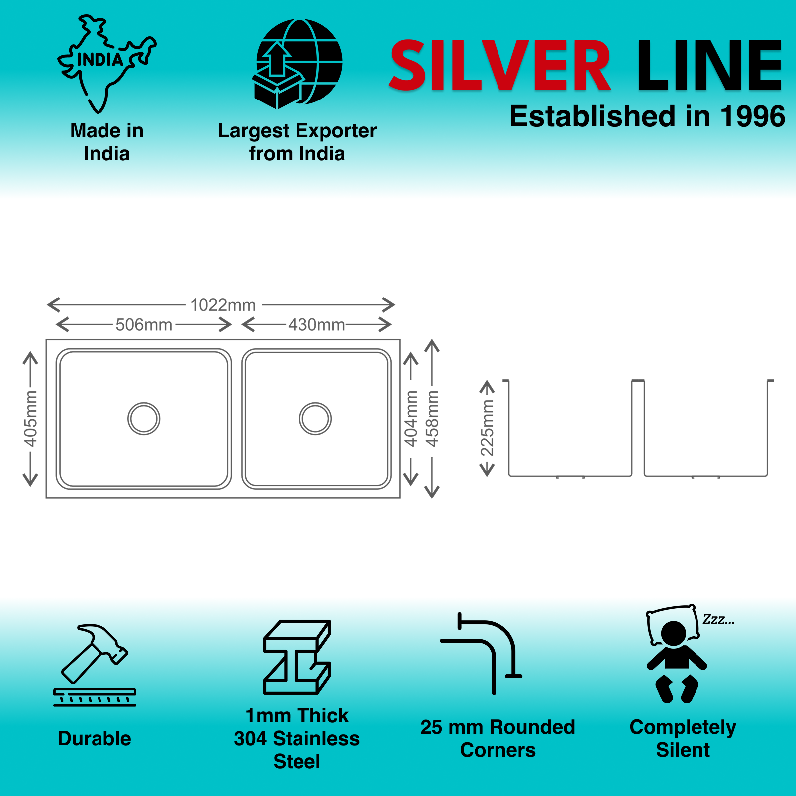 Low Radius Double Bowl 304 Grade Kitchen Sink (40" x 18" x 9")- Silver Line