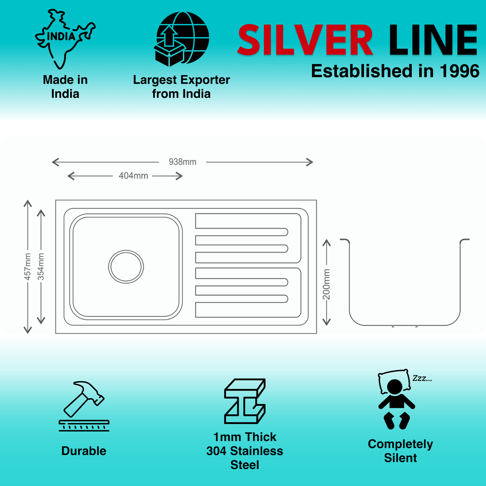 - Sheet Thickness: Precision-engineered with 1mm thick sheet, Silver Line sinks boast an optimized thickness profile that delivers superior low radius curves for longevity and silent performance.